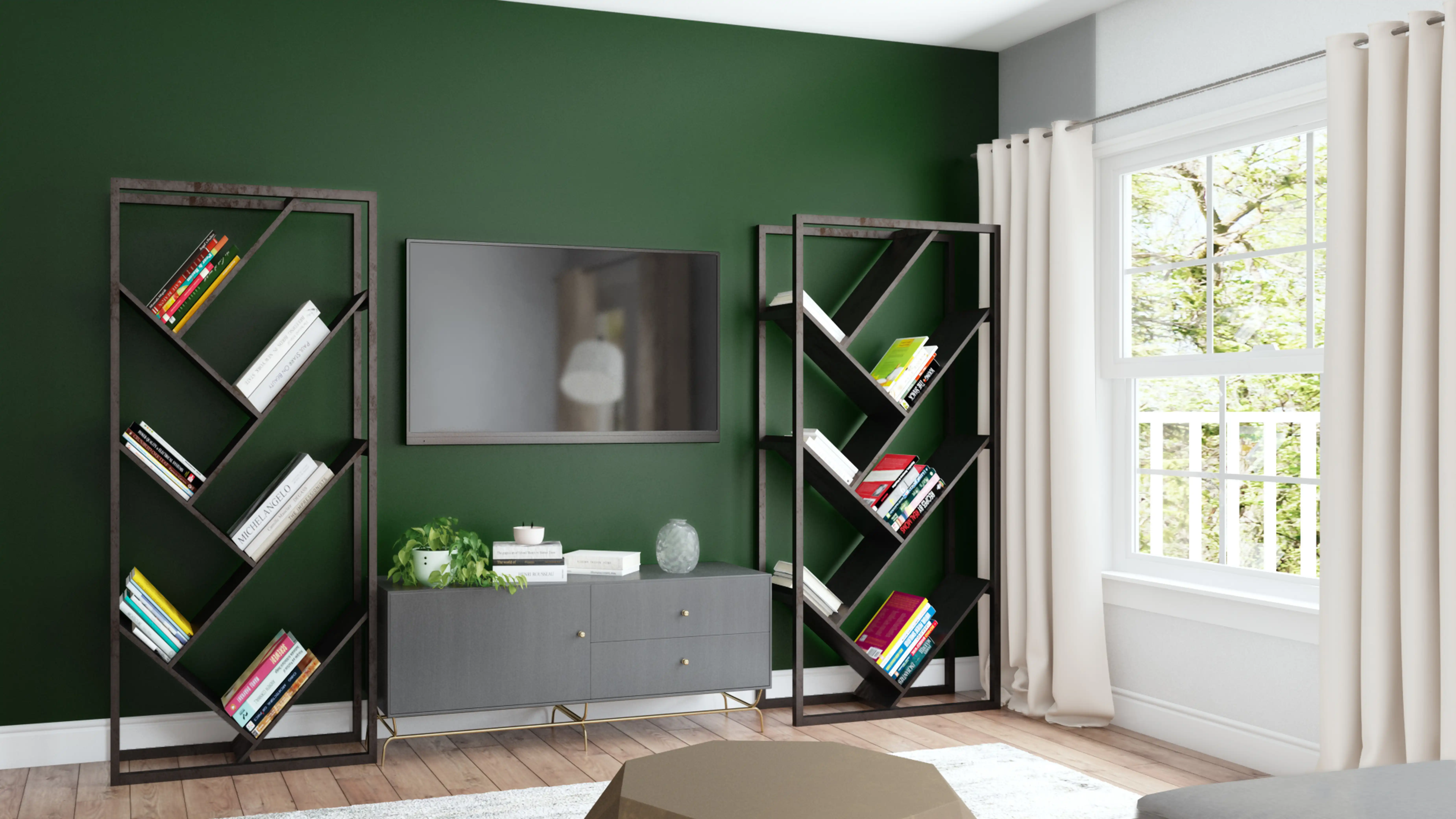 For this room, Katrina selected coffee tables, bookcases, and standing shelves from Roam Common and Wayfair. Discover Furniture design inspiration on Havenly.