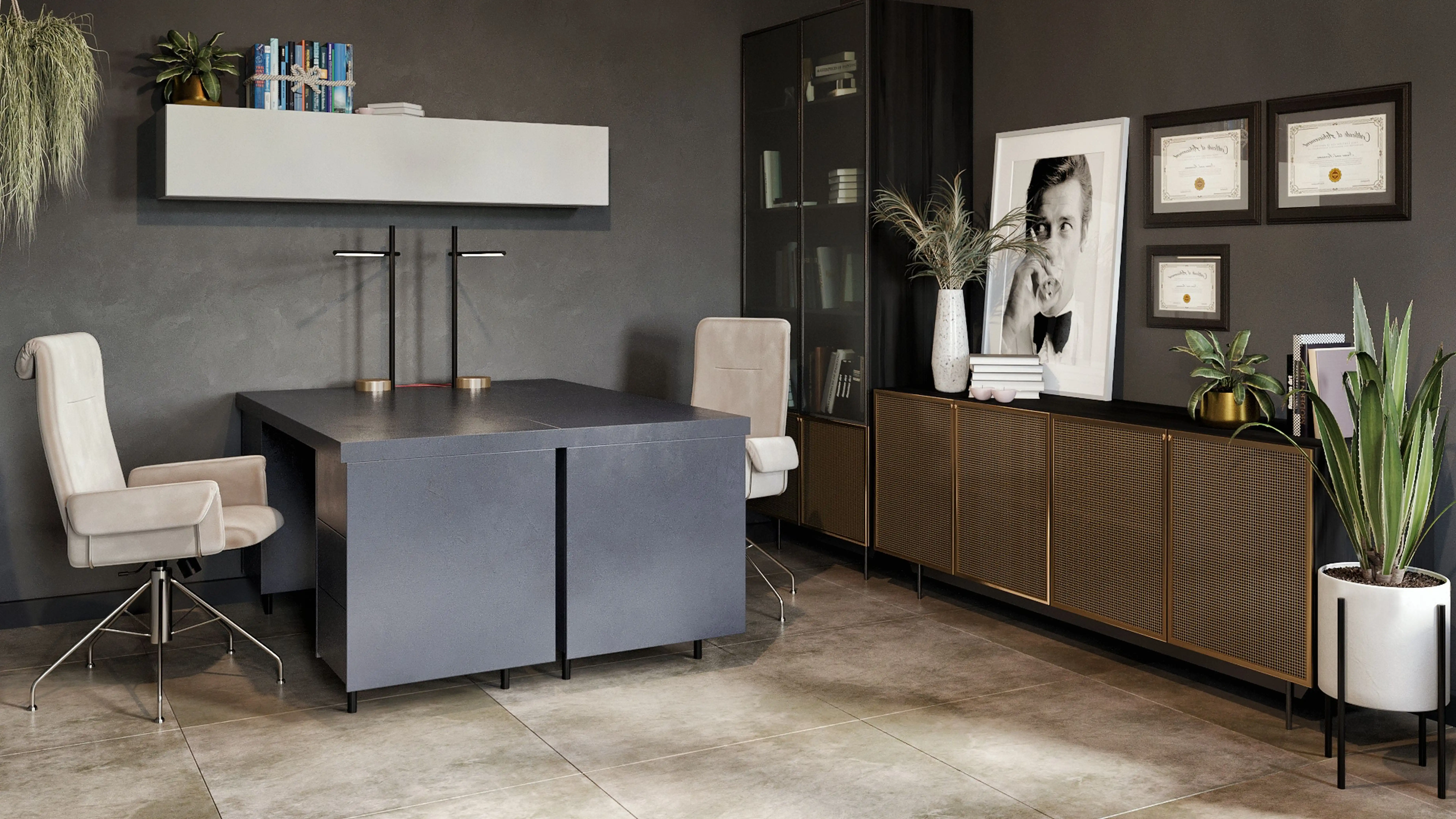 No room is complete without pots, planters, posters, prints, and visual artwork! Mixing up concrete, natural white, matte, 100% cotton rag, acid, and lignin-free archival paper with white, grey, and blue helps to add the finishing touches to the Office. Discover Decor & Pillow design inspiration on Havenly.