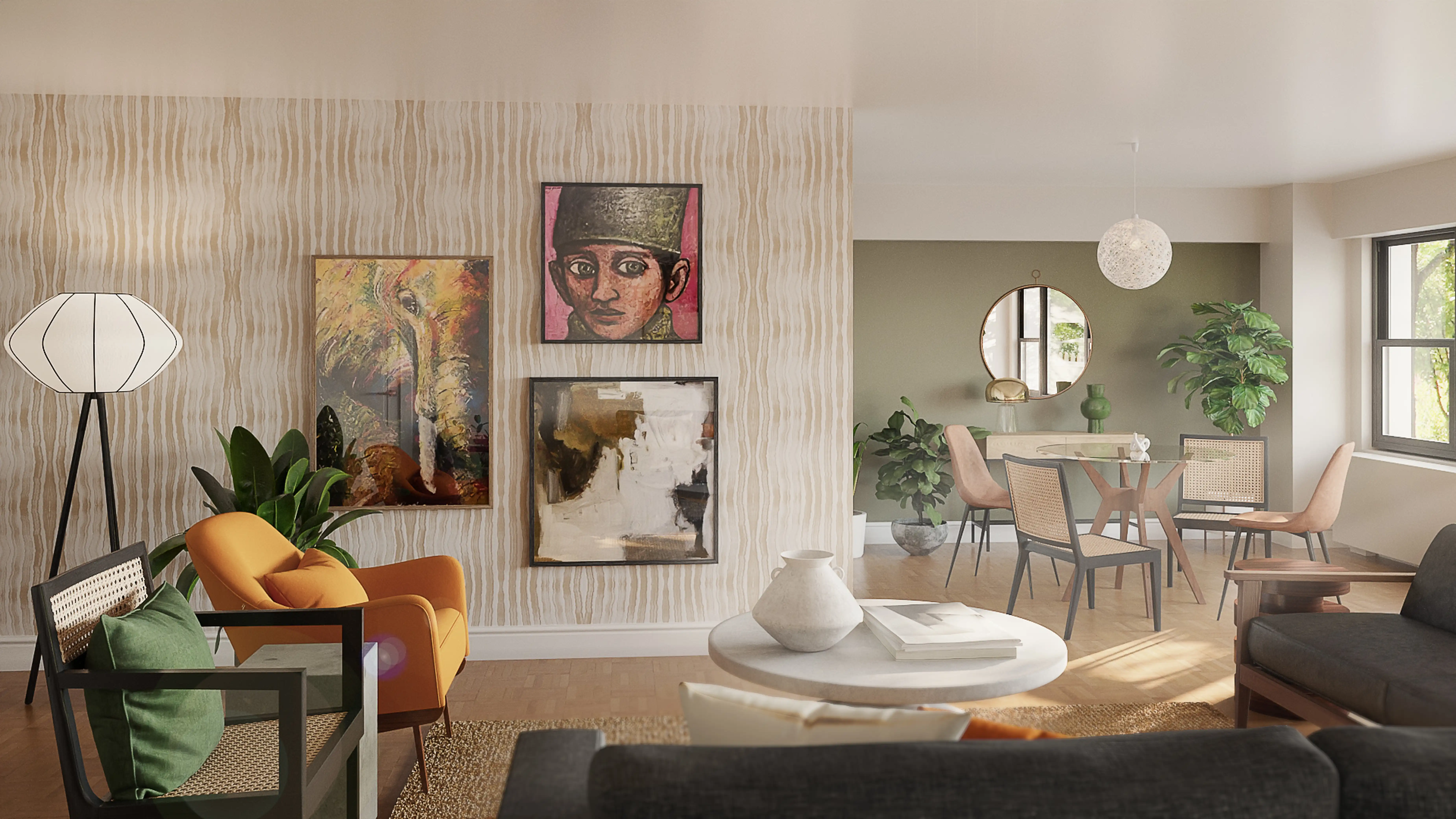 To brighten the design, Eclectic lamps and chandeliers were added to the room. Discover Lighting design inspiration on Havenly.