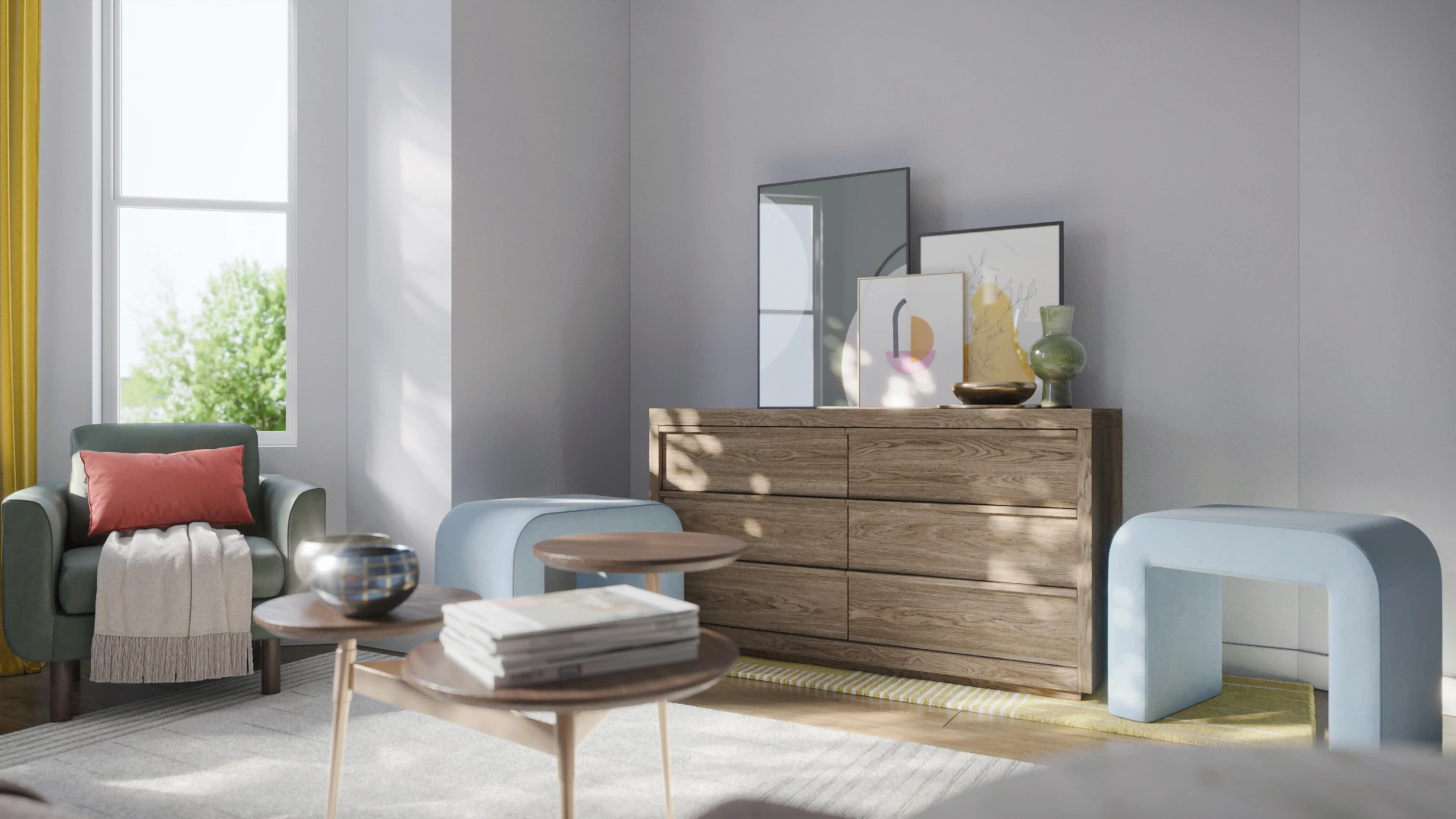 No room is complete without throw pillows, curtains, and drapes! Mixing up 100% cotton, 100% cotton, and cotton with blue and marigold (yellow) helps to add the finishing touches to the room. Discover Decor & Pillow design inspiration on Havenly.