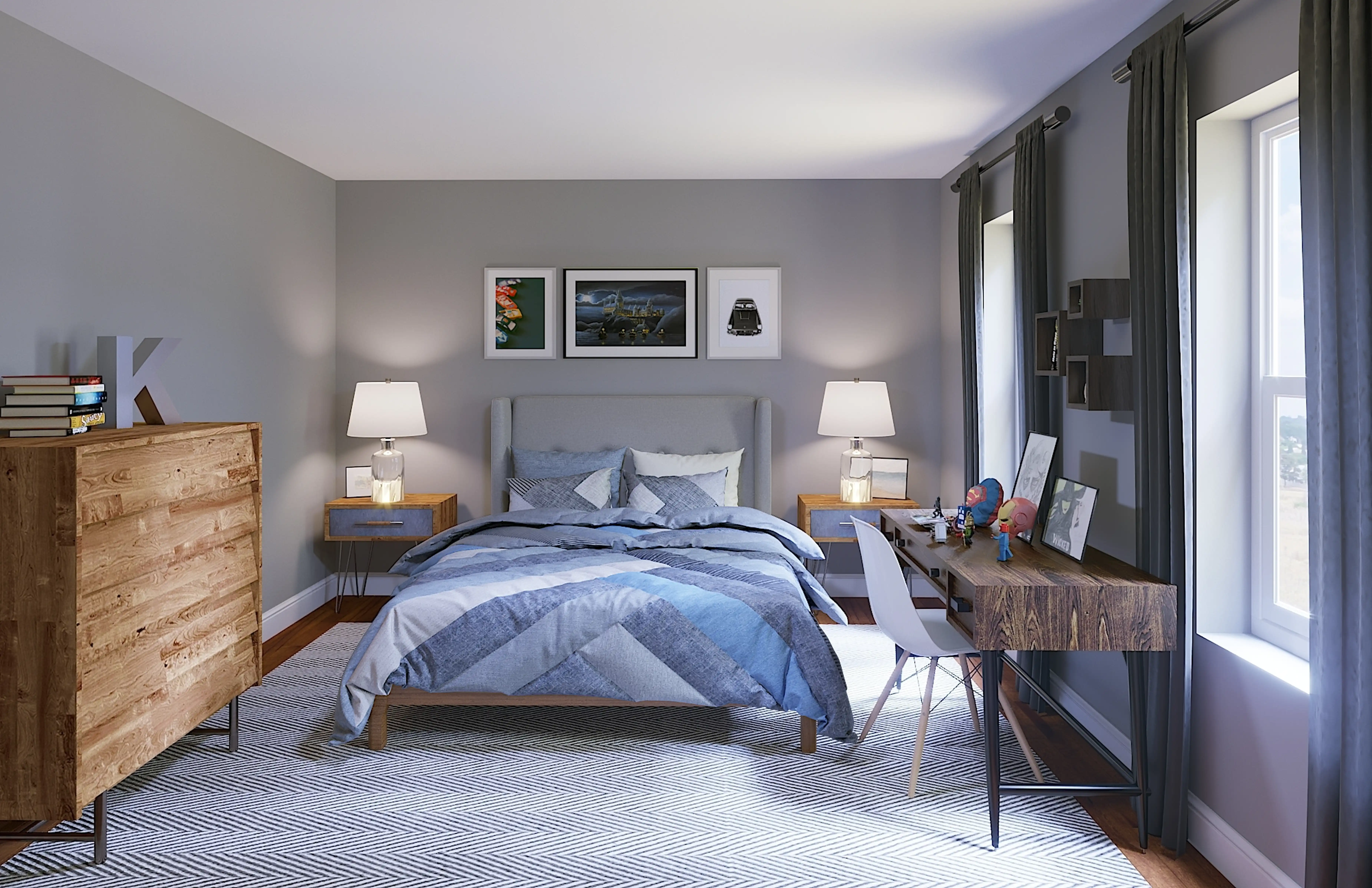 For this room, Brady selected desks, wall shelves, and ledges from Modway Furniture and Wayfair. Discover Furniture design inspiration on Havenly.