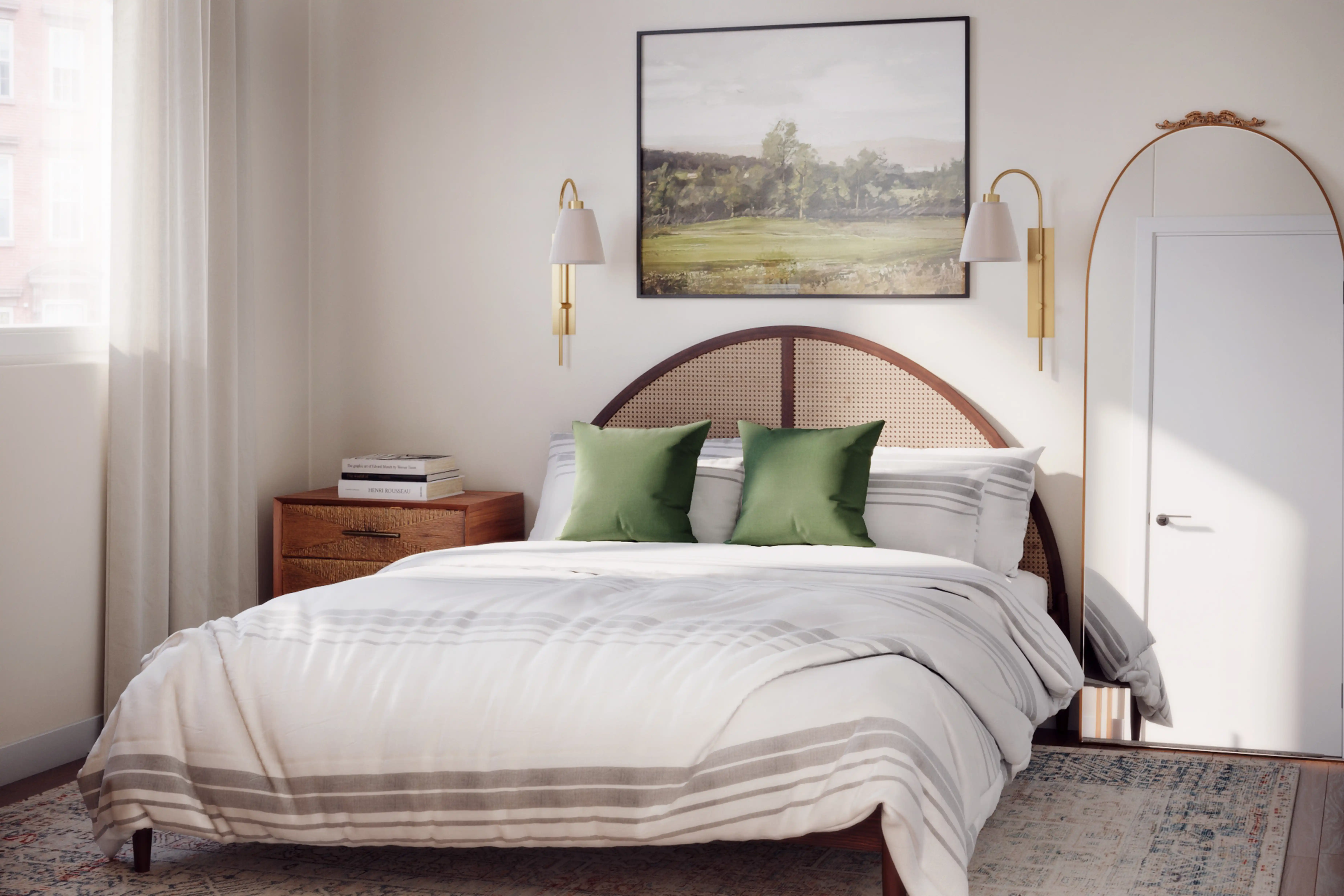 No room is complete without posters, prints, visual artwork, and throw pillows! Mixing up n/a and velvet with green, white/gold frame, and moss helps to add the finishing touches to the Bedroom. Discover Decor & Pillow design inspiration on Havenly.