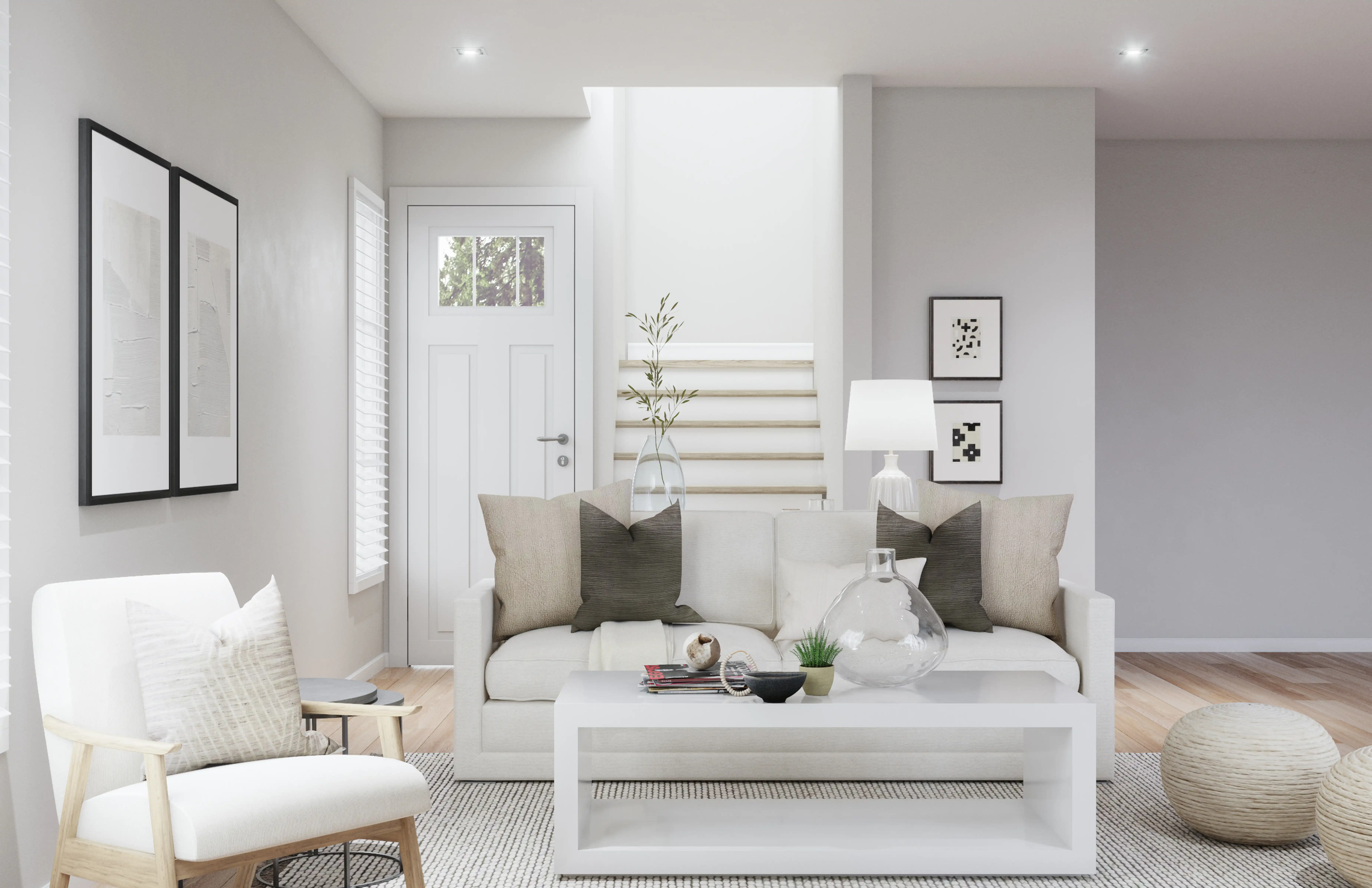 An elegant, Eclectic living room that combines multiple textures. The white sofa is layered with modern pillows. The modern white geometric table adds symmetry to the room. The room is decorated with a glam lamp, plants, and woven baskets.