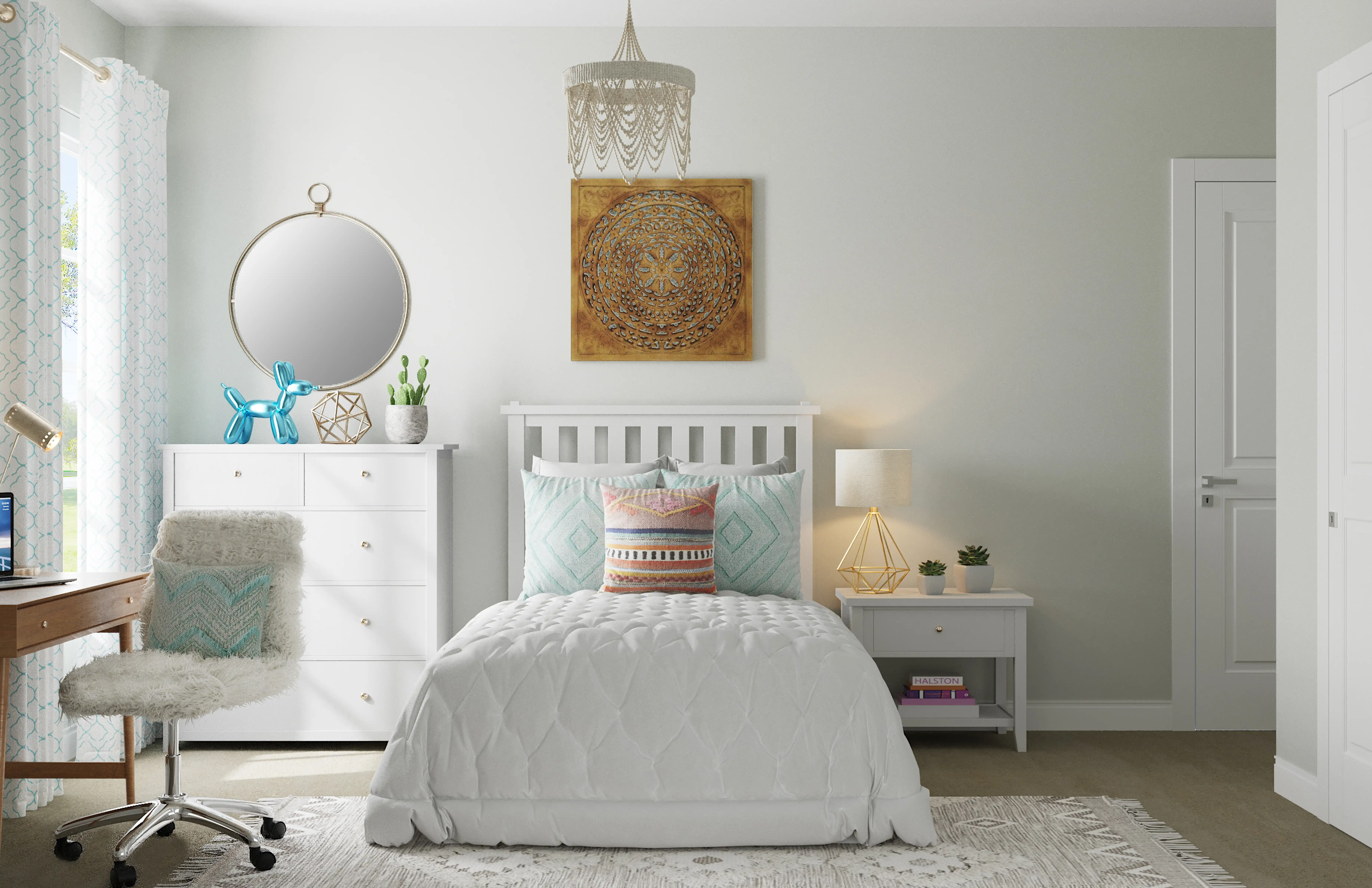 For this Bedroom, Fendy selected desks, kitchen, and dining room chairs from West Elm and Pottery Barn Teen. Discover Furniture design inspiration on Havenly.