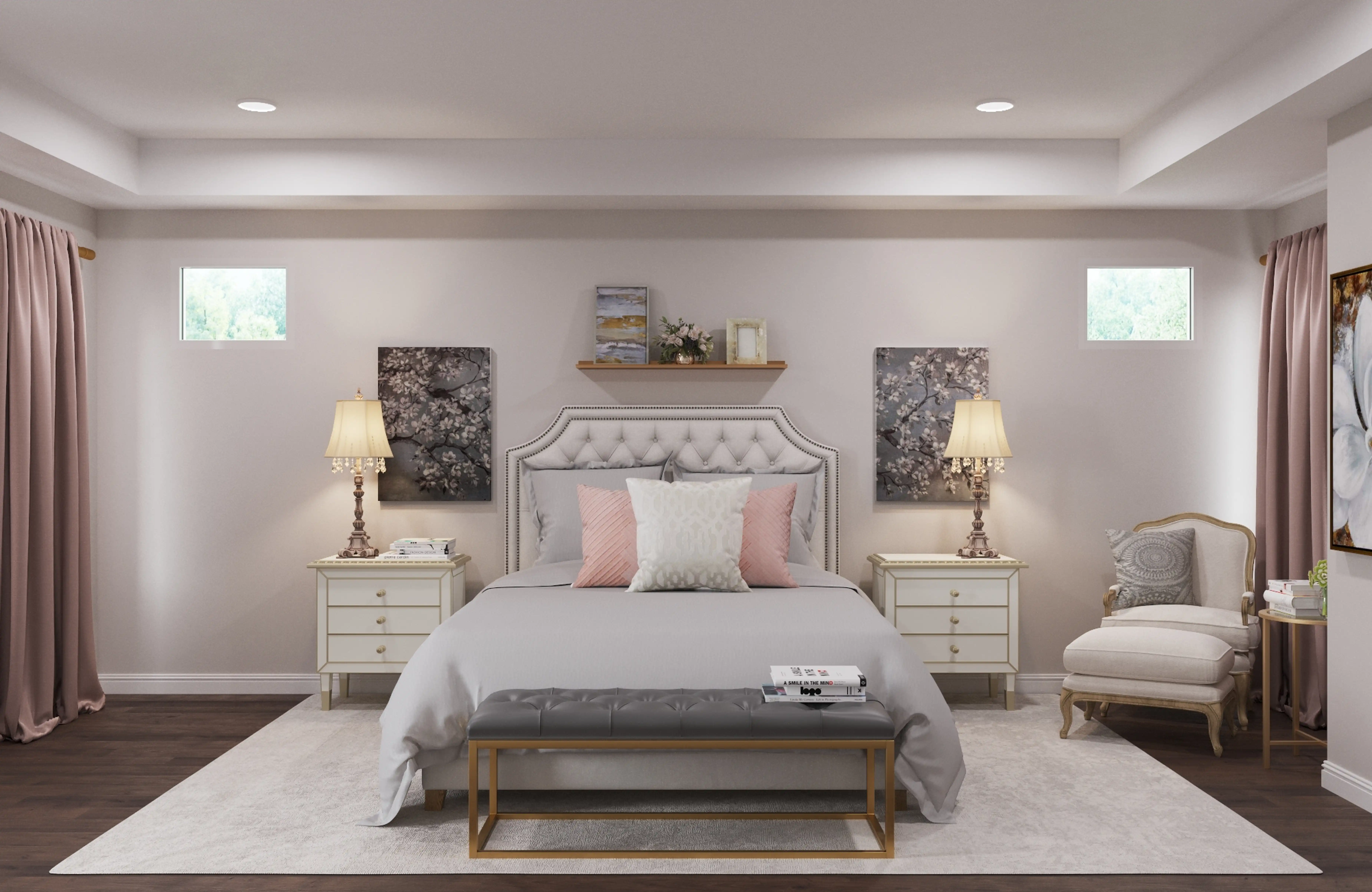 For this Bedroom, Kacie selected end tables and ottomans from Wayfair and Home Depot. Discover Furniture design inspiration on Havenly.
