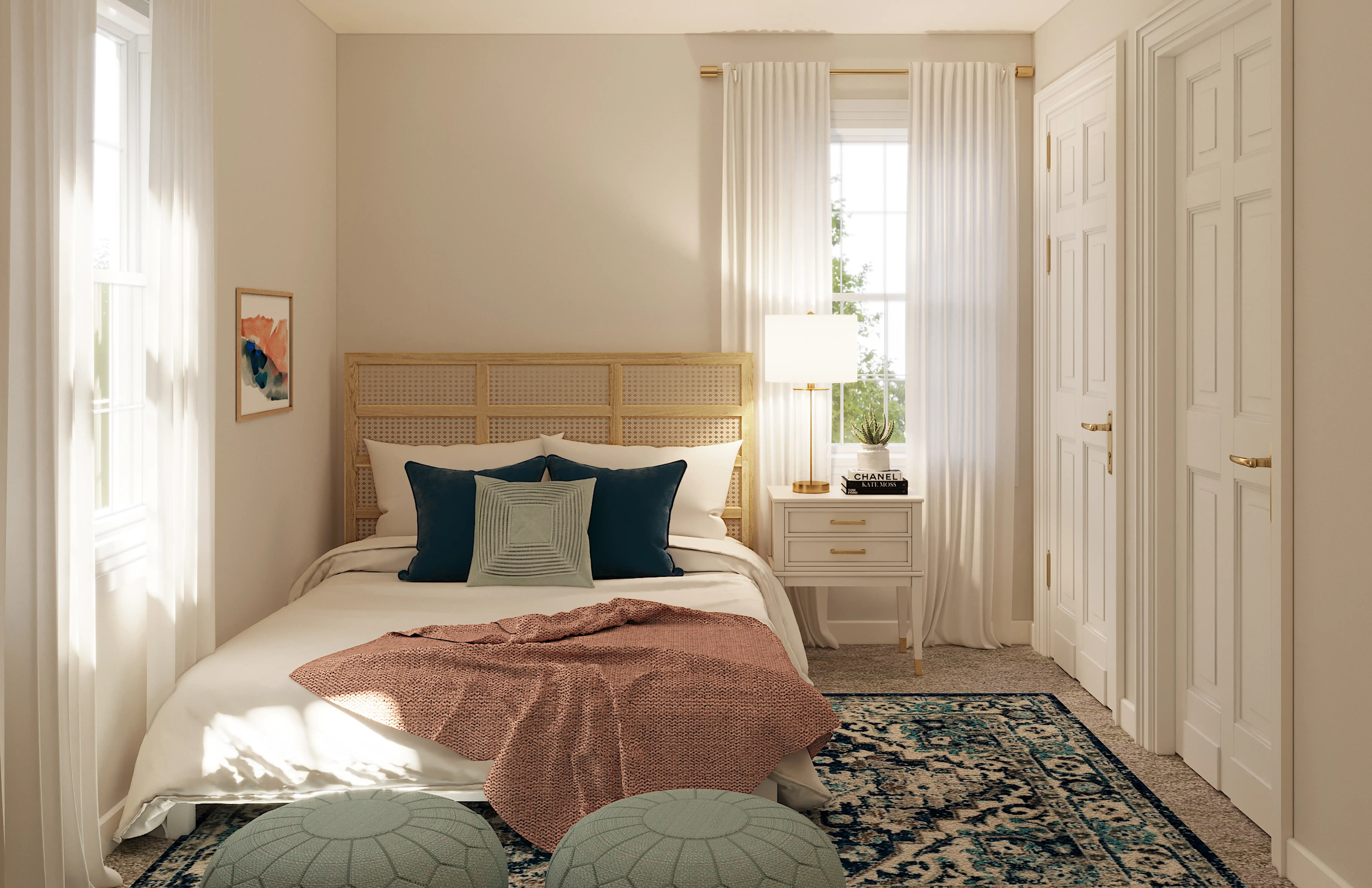For this Bedroom, Emily selected nightstands and poufs from Wayfair and CB2. Discover Furniture design inspiration on Havenly.